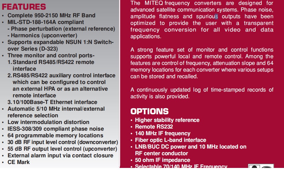 頻率范圍: 上變頻器:140MHz或者70MHz到950-2150MHz。 下變頻器:950-2150MHz到140MHz。